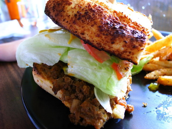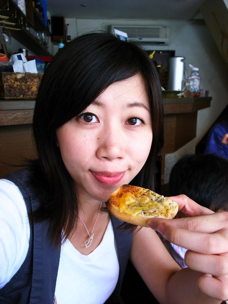 我和嬋一人解決掉一個,香料很讚,一入口就好香阿,麵包選的是軟式芝士麵包,烤的焦焦的,迷人